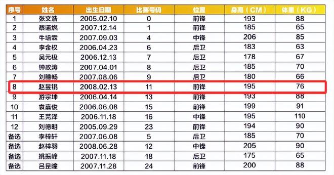 2023年赵昱锟在代表广东青年队参加耐高比赛时身高只有1.95米,短短两年这个孩子长高了足足8厘米,他一跃成为广东青年队在锋线上的超级大杀器。