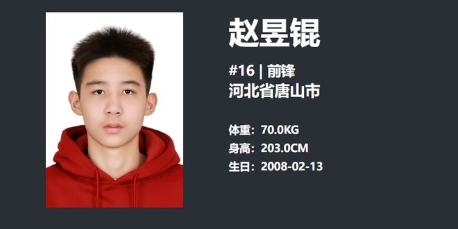 目前赵昱锟17岁,身高2.03米,体重70公斤,孩子这么高才140斤的确有些太瘦弱,不过运动能力很强,比赛中也是各种暴扣。