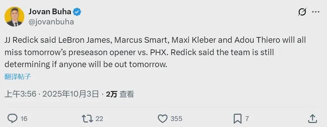 北京时间10月3日,湖人官方宣布:詹姆斯(臀部)、斯玛特(跟腱炎)、克莱伯(股四头肌)和阿杜-蒂耶罗(膝盖),将缺席明天和太阳的季前赛。太阳杰伦-格林轻度腿筋拉伤,也不能打。三天之前克莱伯说自己100%恢复健康,如今又伤了。