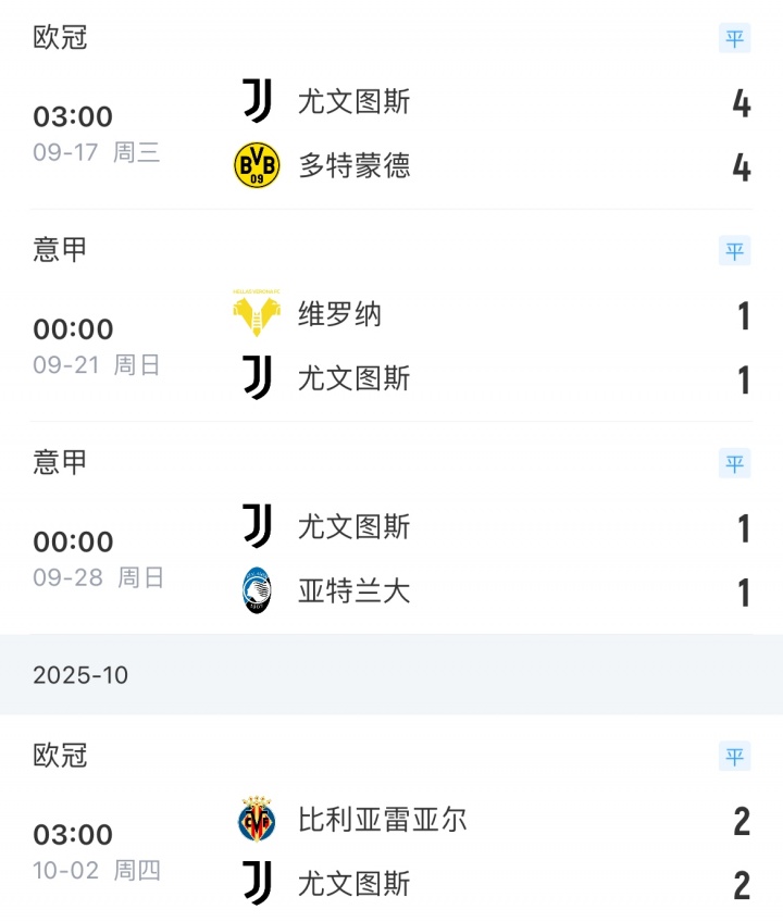 平局大师!尤文4连平追平上赛季平局纪录,上赛季联赛18胜16平4负