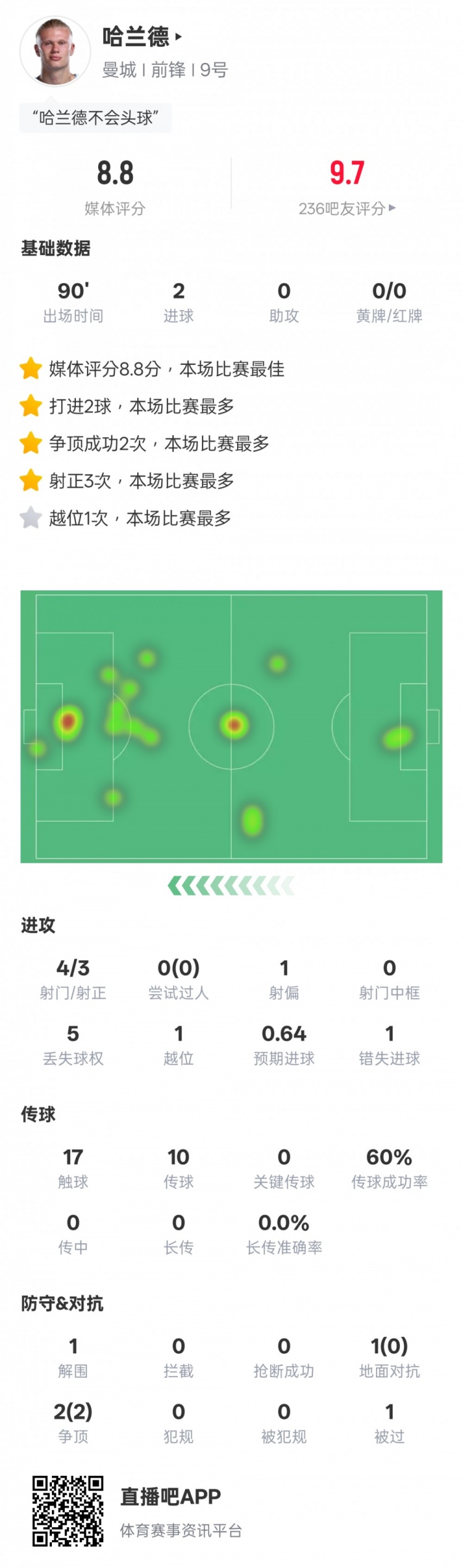 哈兰德本场数据:3射正2进球1错失进球机会,评分8.8全场最高