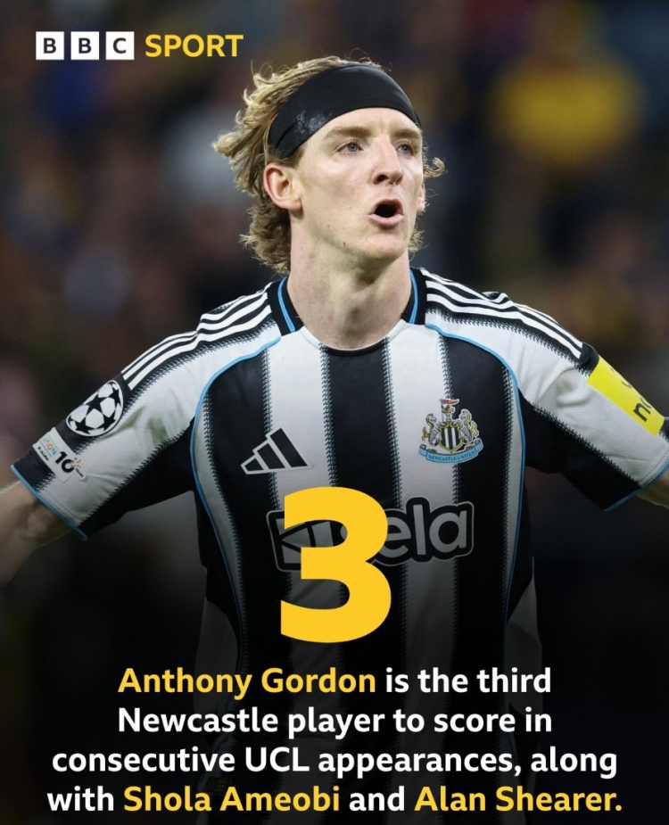 戈登成为纽卡队史第三位在欧冠中连场进球的球员,之前两位为阿梅奥比和“喜鹊”传奇希勒。
