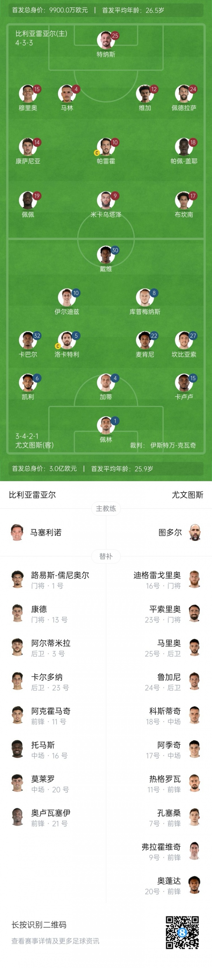 比利亚雷亚尔首发:25-特纳斯、4-马林、12-维加、15-穆里奥、24-佩德拉萨、10-帕雷霍、14-康萨尼亚、18-帕佩·盖耶、9-米卡乌塔泽、17-布坎南、19-佩佩