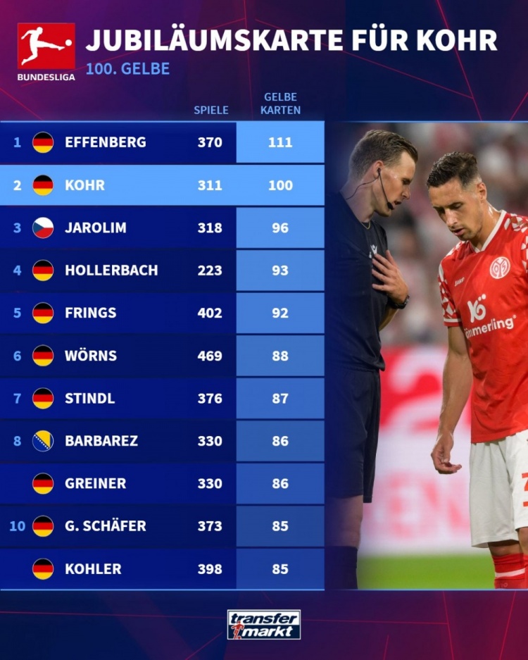 10月7日讯 德国转会市场统计了球员在德甲联赛中吃到黄牌的数量,并列出榜单,埃芬博格111黄居首,科赫100黄次席。