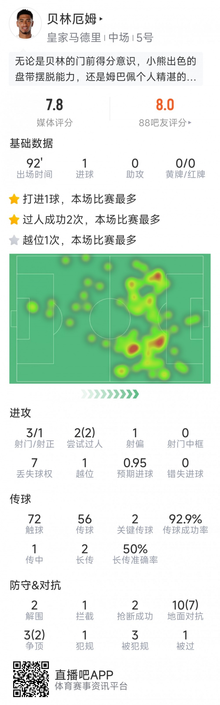 贝林厄姆本场数据:打进制胜球,3射1正,2次关键传球