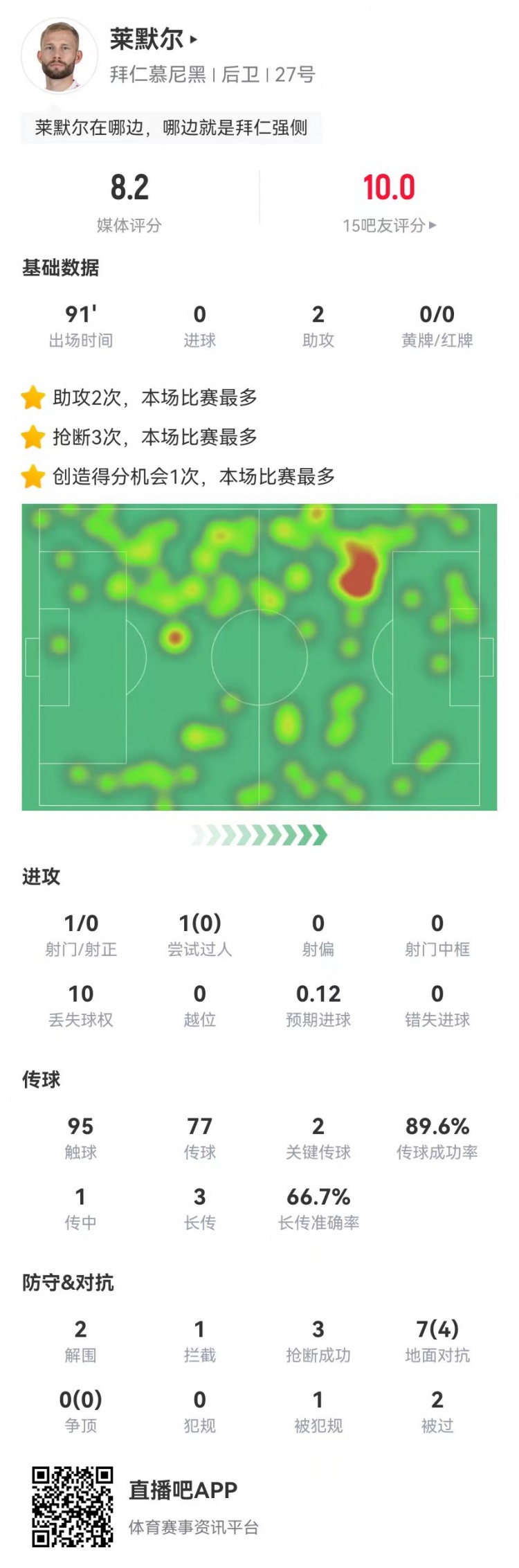 10月23日讯 拜仁在本轮欧冠4-0击败布鲁日,莱默尔本场数据如下: