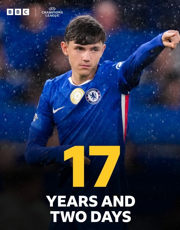 据统计,17岁的沃尔什创造了蓝军队史最年轻欧冠登场纪录。