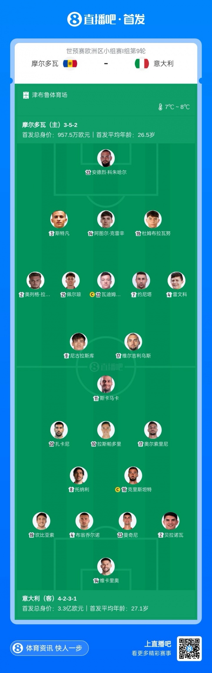 11月14日讯 世预赛欧洲区小组赛I组第9轮,摩尔多瓦主场迎战意大利,赛前首发名单公布。