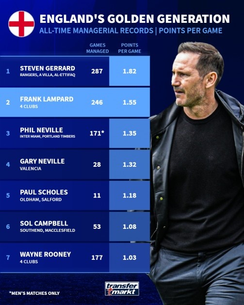德国转会市场盘点了英格兰“黄金一代”球员在教练岗位上的执教战绩,杰拉德以场均1.82分居首,兰帕德以场均1.55分位居次席。